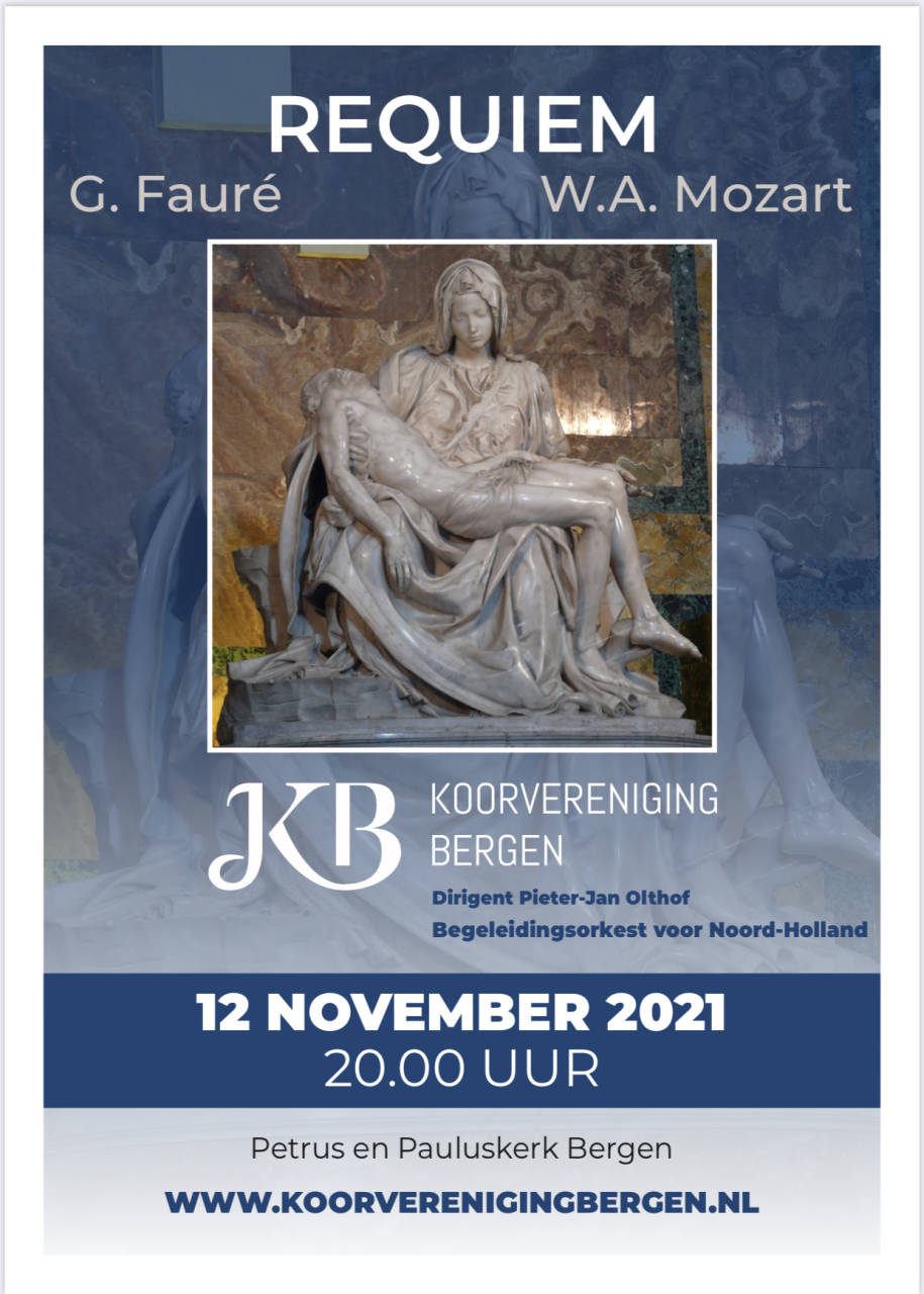 Op 12 November voert de koorvereniging Bergen in de Petrus en Pauluskerk in Bergen de Requiems van Fauré en Mozart uit o.l.v. hun immer enthousiaste en bezielde dirigent Pieter Jan Olthof. Ik was er al vaker te gast en verheug me er erg op deze twee prachtige stukken uit te voeren, samen met collega’s Lien Haegeman(alt), Jeroen de Vaal (tenor), Pieter Hendriks (bas), Wim Voogt (orgel) en het Begeleidingsorkest voor Noord-Holland.